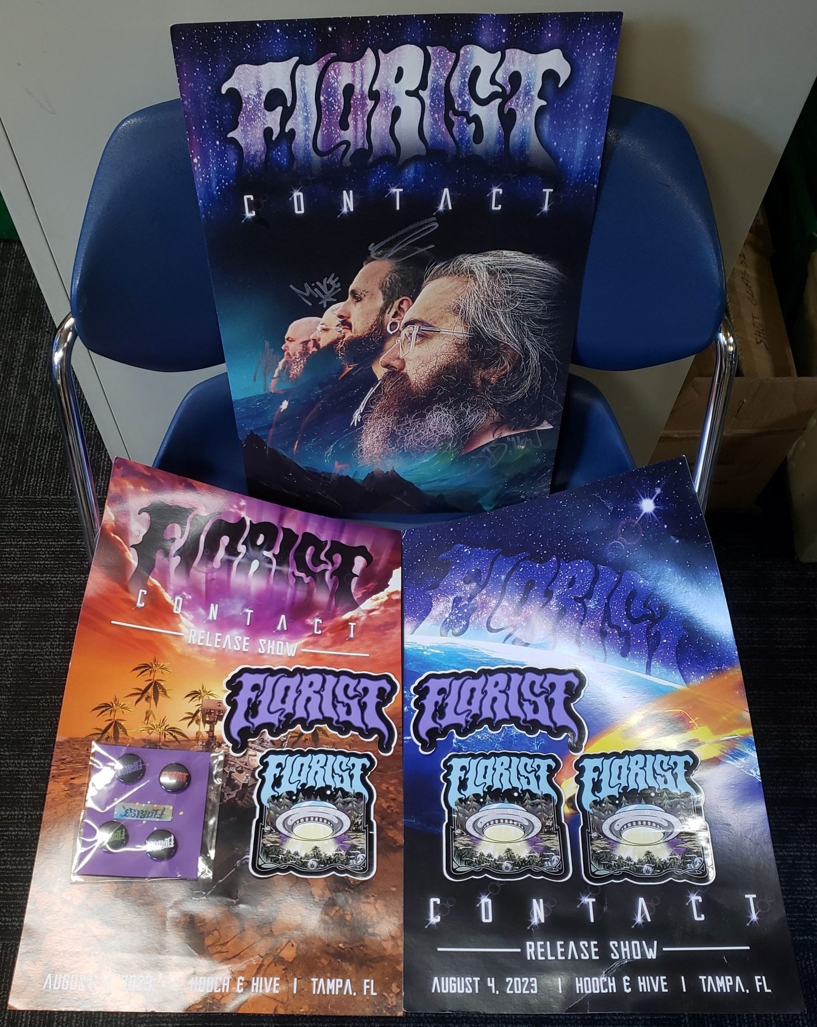 3 posters for the indie folk band Florist, 1 signed, as well as buttons and stickers